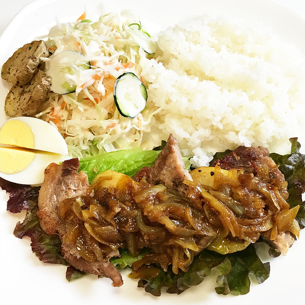 今日と明日のランチは「豚肉とポテトのソテー オニオンカレーソースがけ」です♪