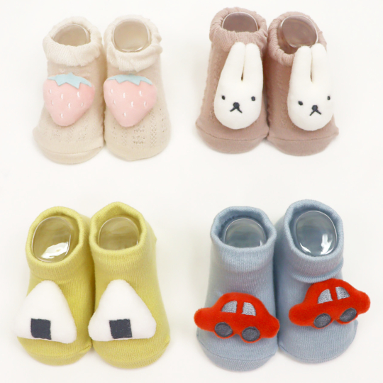 | ぷっくりモチーフ カップ入りベビーソックス Color:YELLOW(オニギリ),BLUE(クルマ),IVORY(イチゴ),PINK(ウサギ) Size:XS(9-11cm) Price:880円 通販はこちらから |