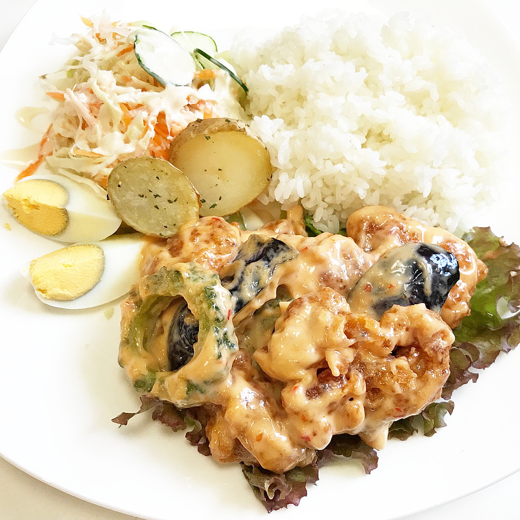 今日と明日のランチは「鶏唐揚げのチリマヨ和え」です♪