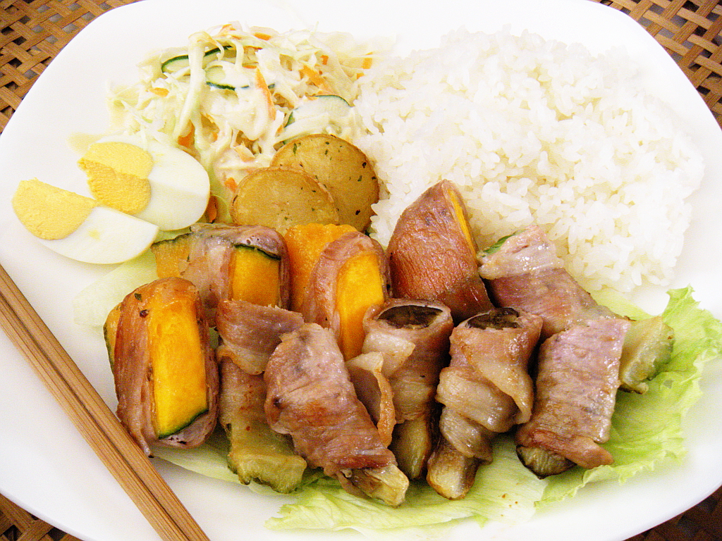 今日と明日のランチは「三色野菜のベーコン巻き」です♪